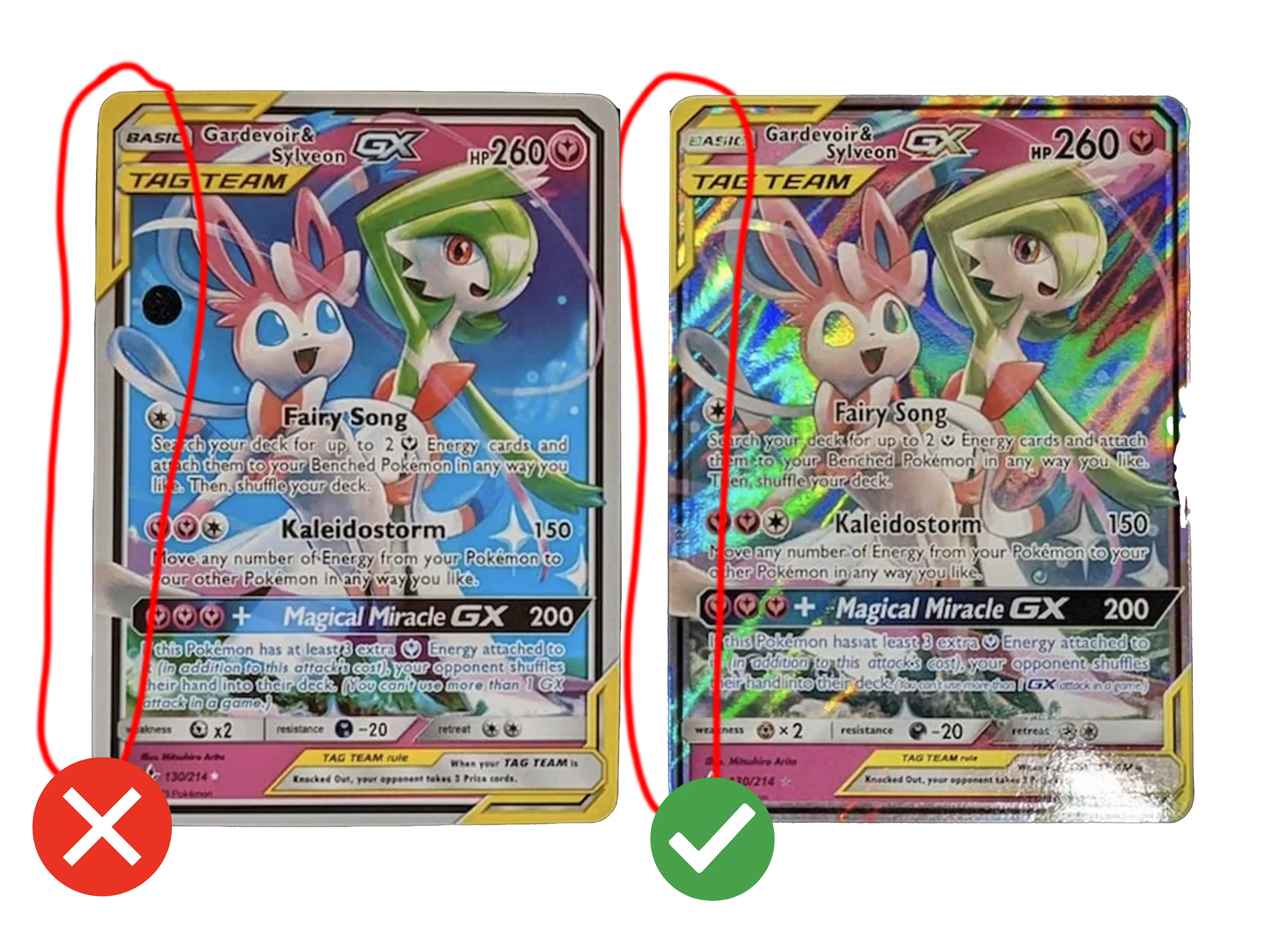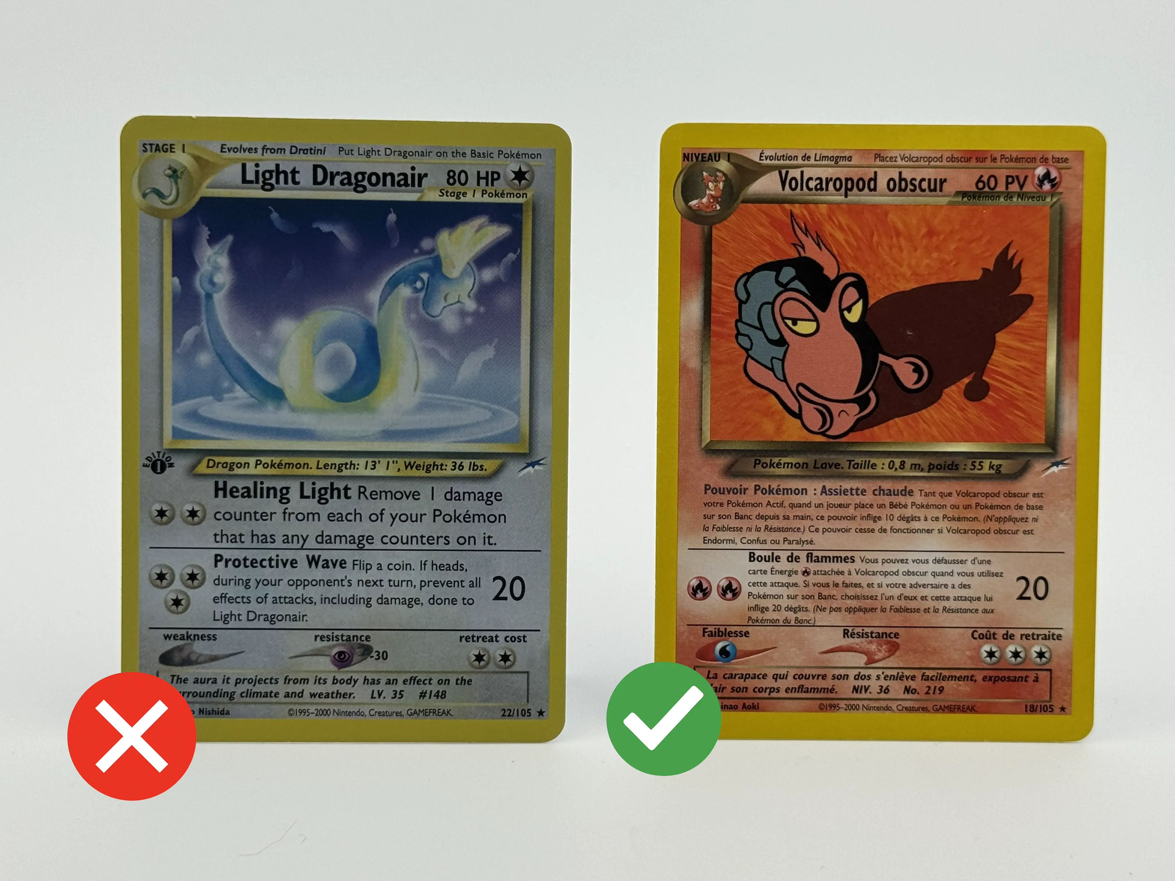 Le moyen le plus simple et le plus sûr pour identifier une fausse carte Pokémon, c’est la comparaison directe avec une carte authentique du même type (même série, même rareté, même génération).