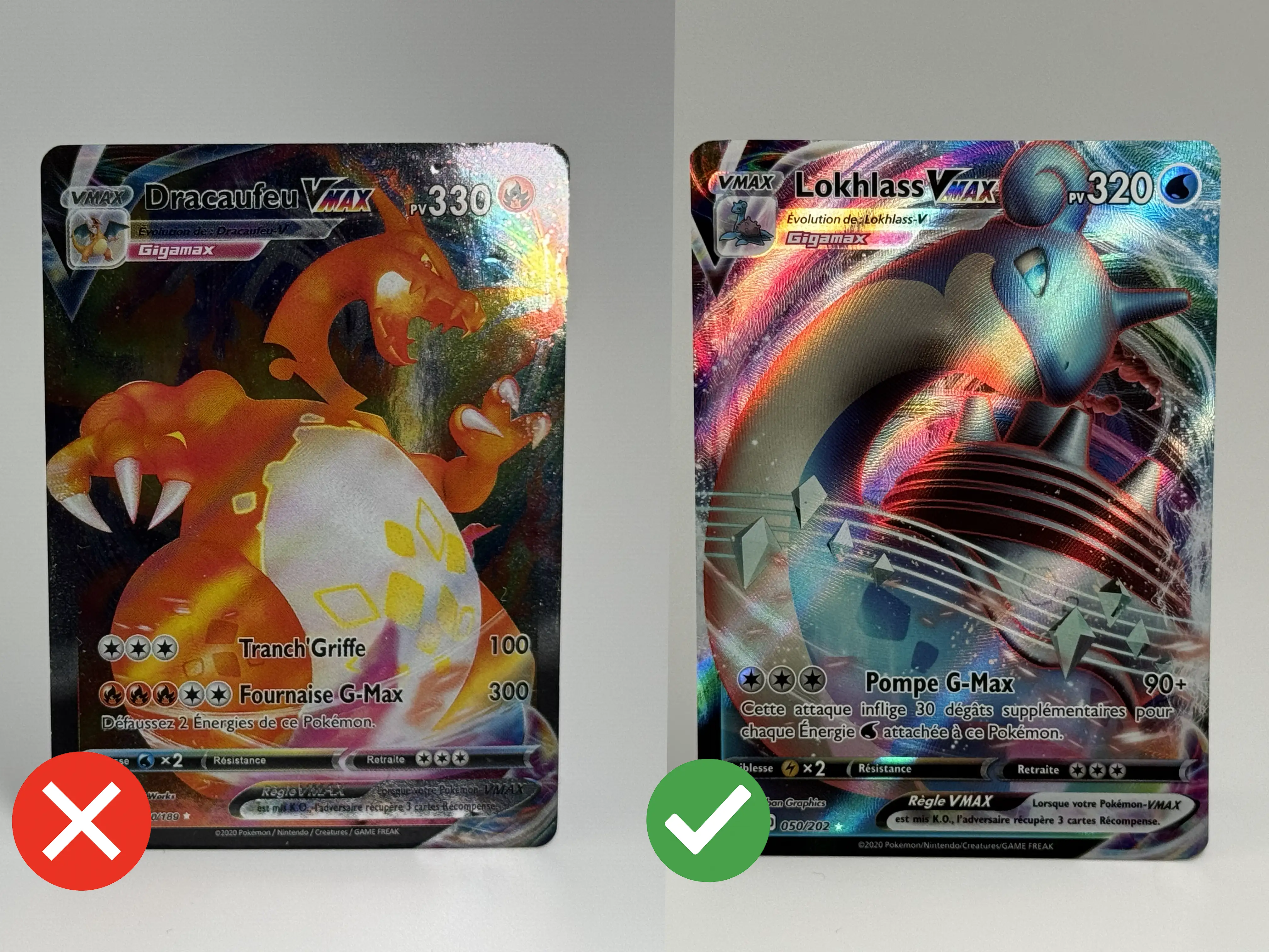 Les fausses cartes holo ou ultra rares présentent fréquemment un reflet arc-en-ciel vertical visible à la lumière. Ce phénomène se manifeste par :