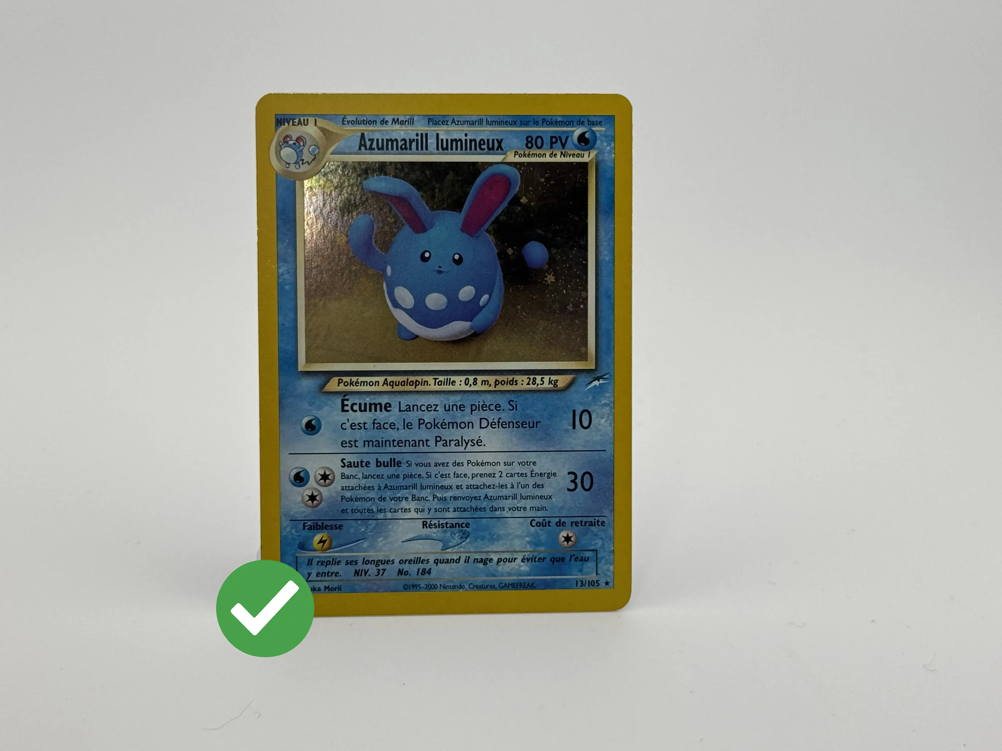 Sur les cartes officielles, le brillant est subtil et diffus : il varie selon la lumière, donnant un effet fluide et naturel. Ce reflet vertical est donc un excellent indicateur d’une carte Pokémon contrefaite, car il résulte d’un film plastique bon marché appliqué après impression.